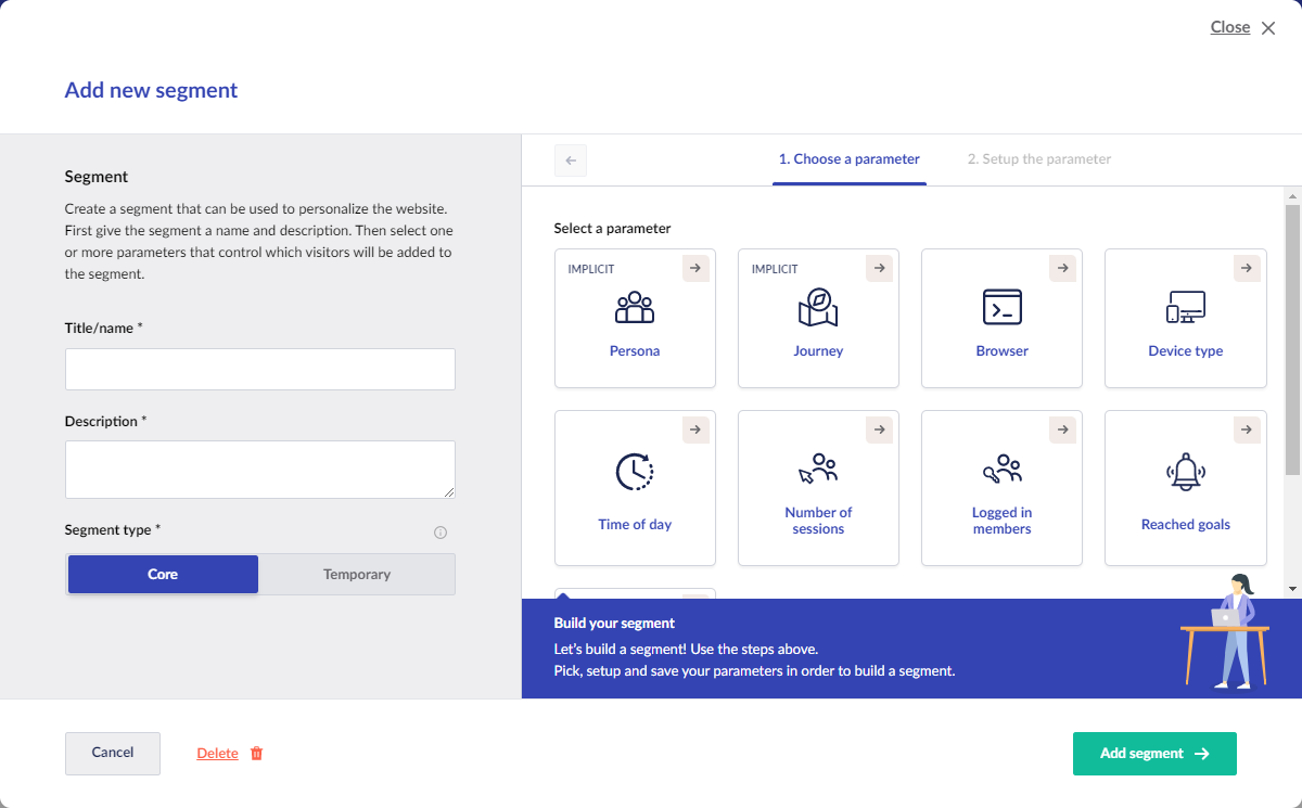 Select Personalization and then Segments. The next step is clicking on Add new segment +
